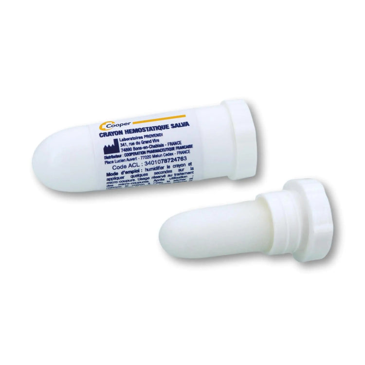 The Cooper Hemostatic Pencil is a stick containing pure aluminum sulfate, ideal for stopping bleeding from minor skin injuries. Easy to apply with its cylindrical plastic holder, it is compact and protected by a screw-on cap. An essential item for every first aid kit.