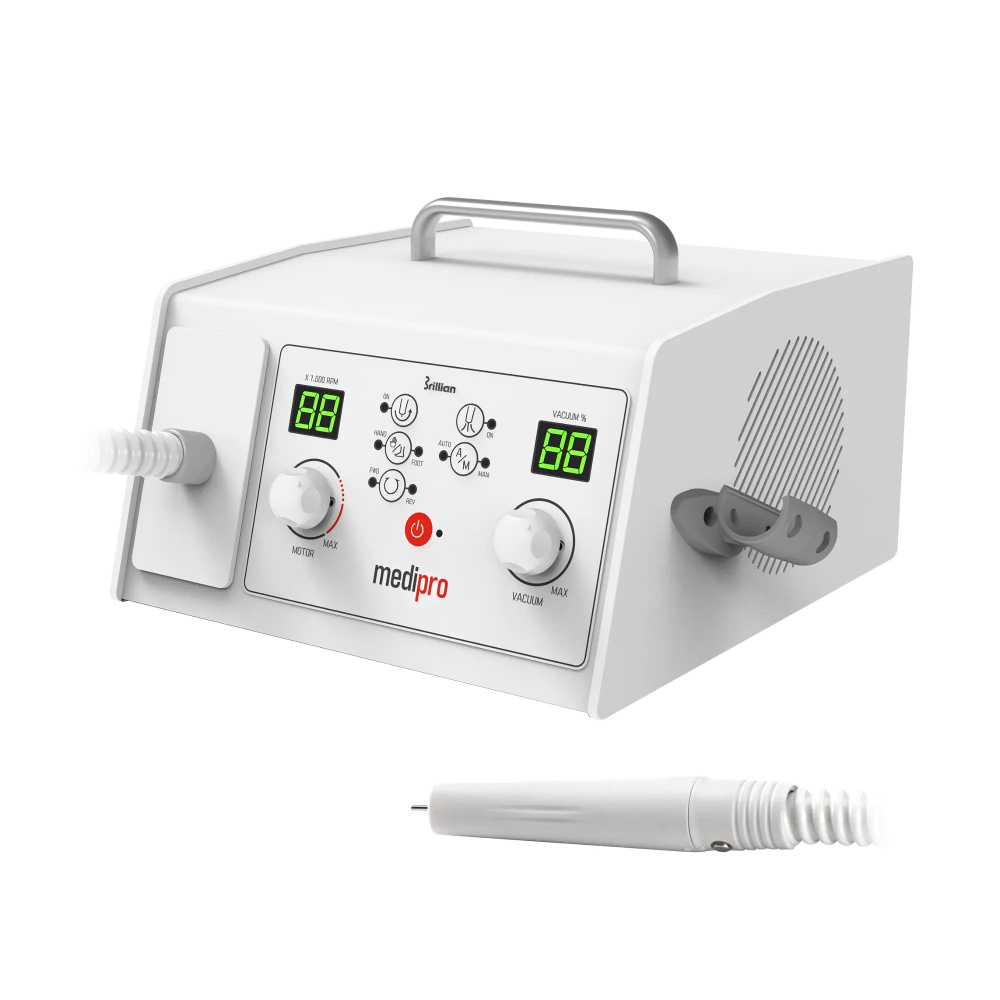 The slim, optimized handpiece incorporates an on/off switch for precise control. The micromotor features a clear display of rotation speed and suction level , as well as an automatic suction setting function and an error display.
